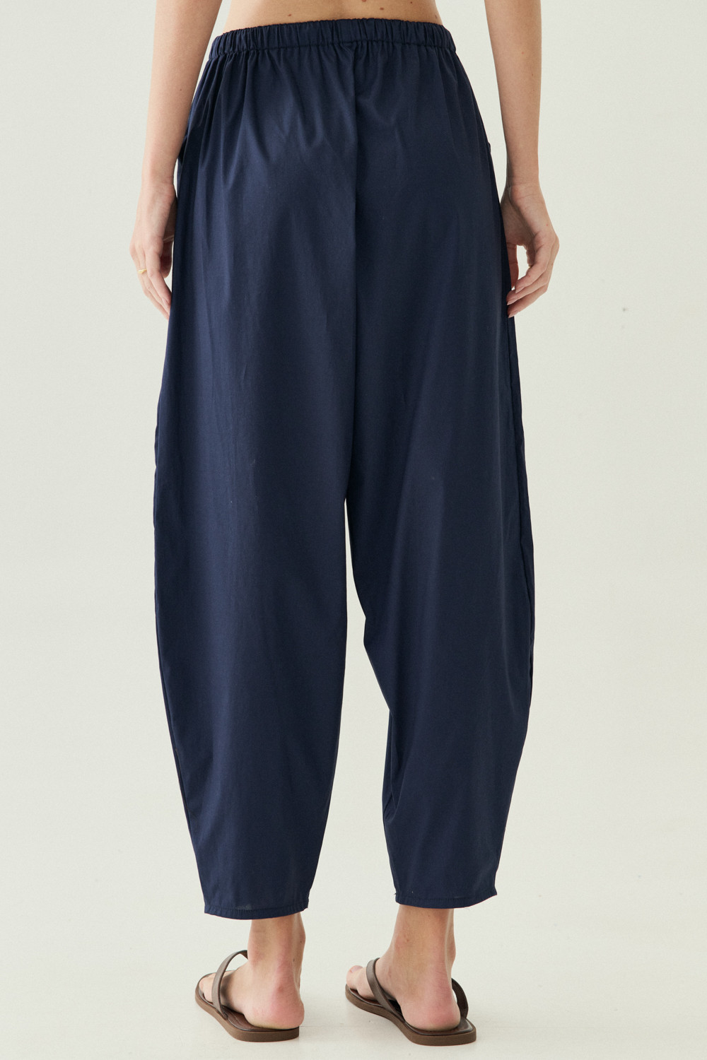 Calça confeccionada em tecido de algodão com elastano, que proporciona conforto e leve elasticidade ao vestir. O modelo possui cós com elástico e amarração, garantindo ajuste prático e confortável ao corpo. A peça conta com bolsos laterais funcionais e modelagem estilo aladdin, com caimento amplo e moderno. Não possui forro, mantendo a leveza ideal para dias mais quentes.
