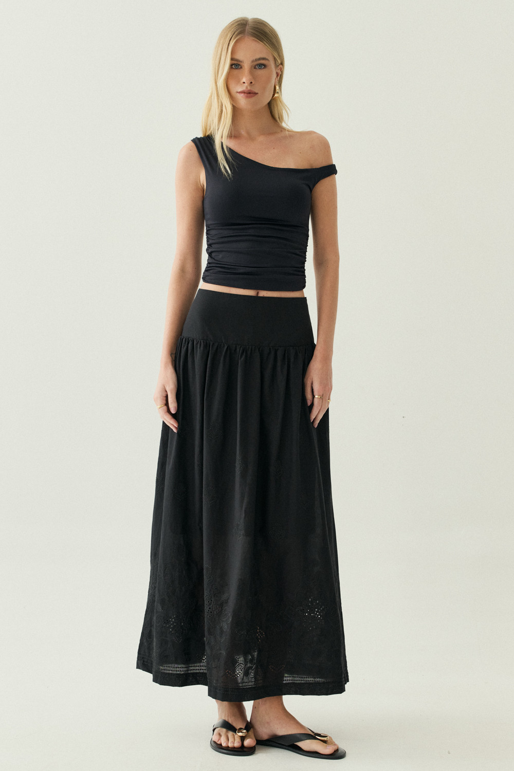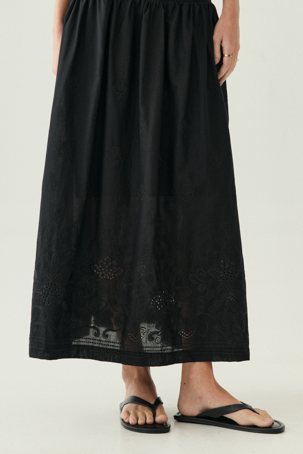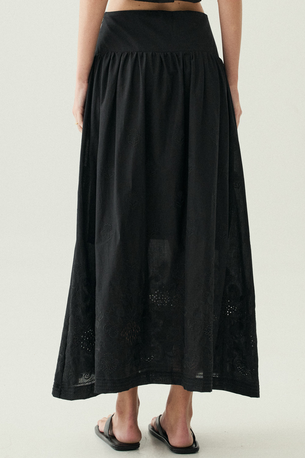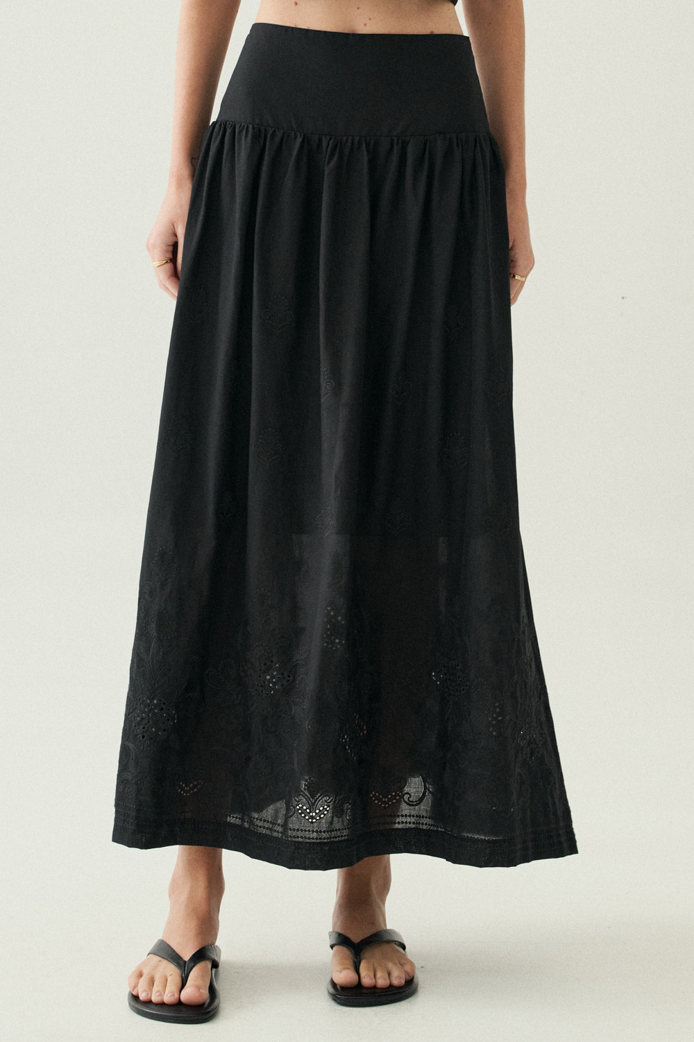 Saia confeccionada em tecido leve com bordado na barra, que traz textura e sofisticação à peça. O modelo possui cintura estruturada e caimento fluido, valorizando a silhueta com elegância. Conta com forro interno, garantindo conforto e evitando transparências, além de fechamento por zíper lateral para um ajuste prático e discreto.