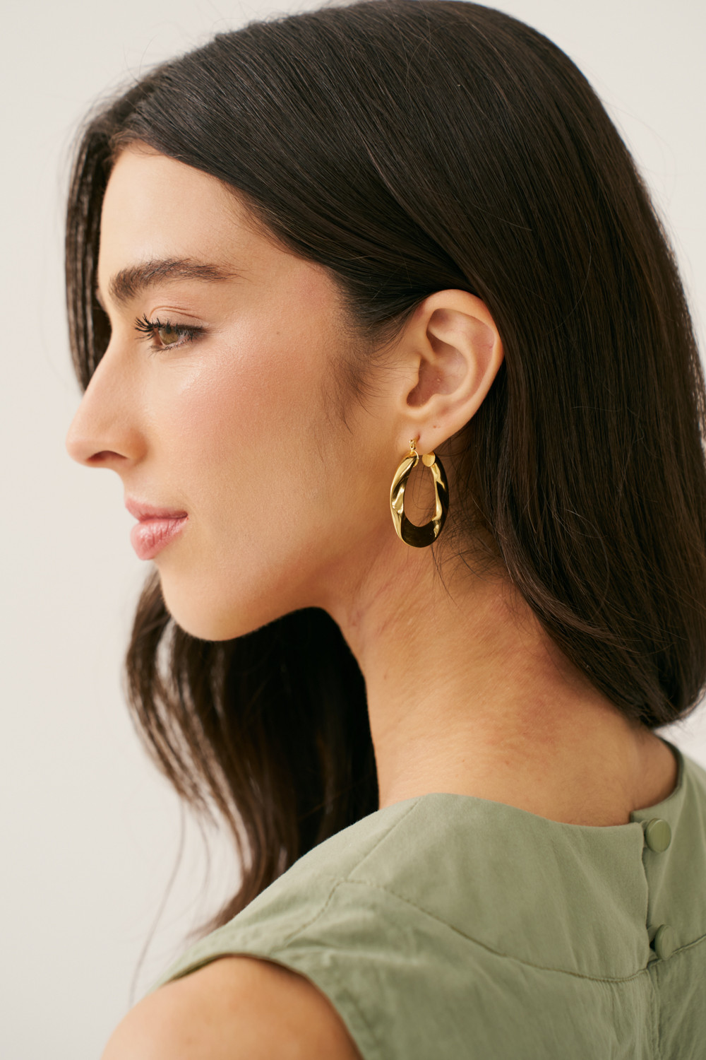 Este brinco argola dourada une elegância e modernidade em um design curvado e sofisticado. Seu formato oval levemente torcido e a superfície polida criam um efeito de brilho suave, que realça o rosto com delicadeza.