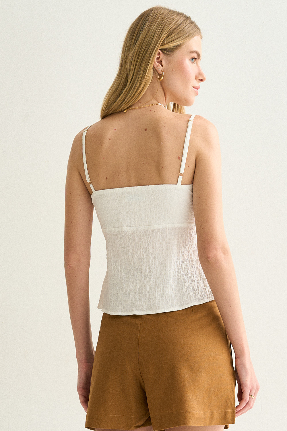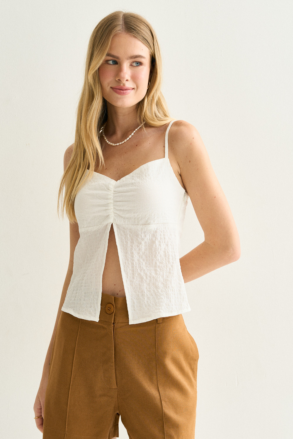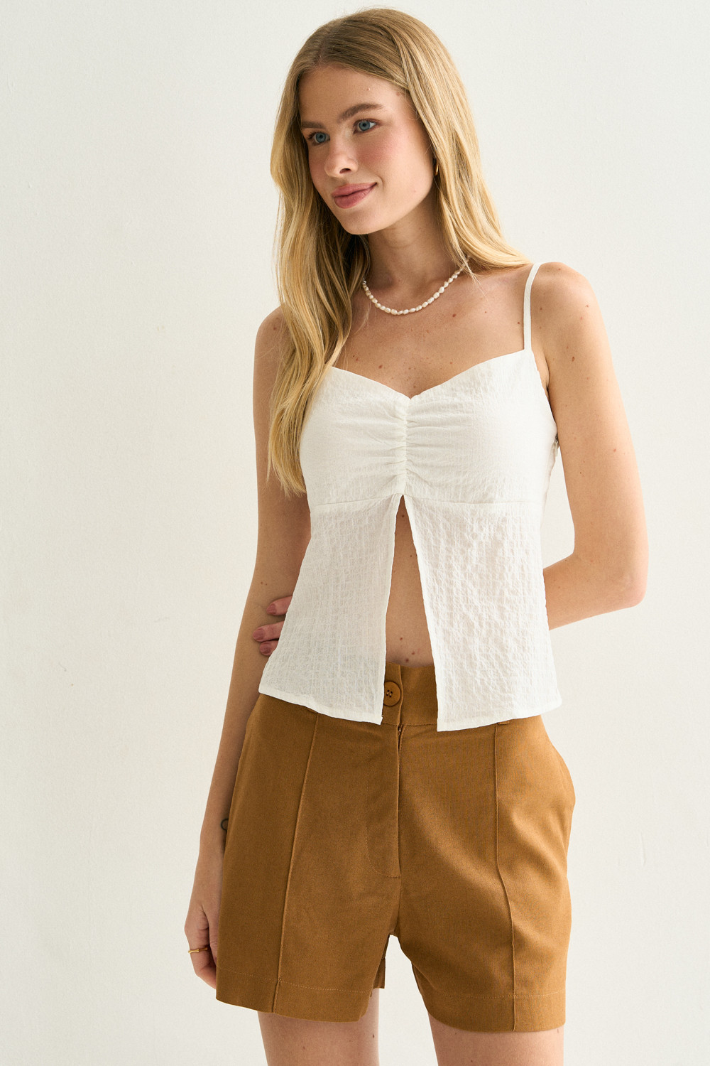 A Regata Franzida Lume é perfeita para composições leves e femininas. Confeccionada em tecido texturizado, traz detalhe franzido no busto e fenda frontal que adiciona movimento. As alças são reguláveis, e a peça possui zíper invisível lateral e elástico nas costas para garantir mais segurança ao vestir.