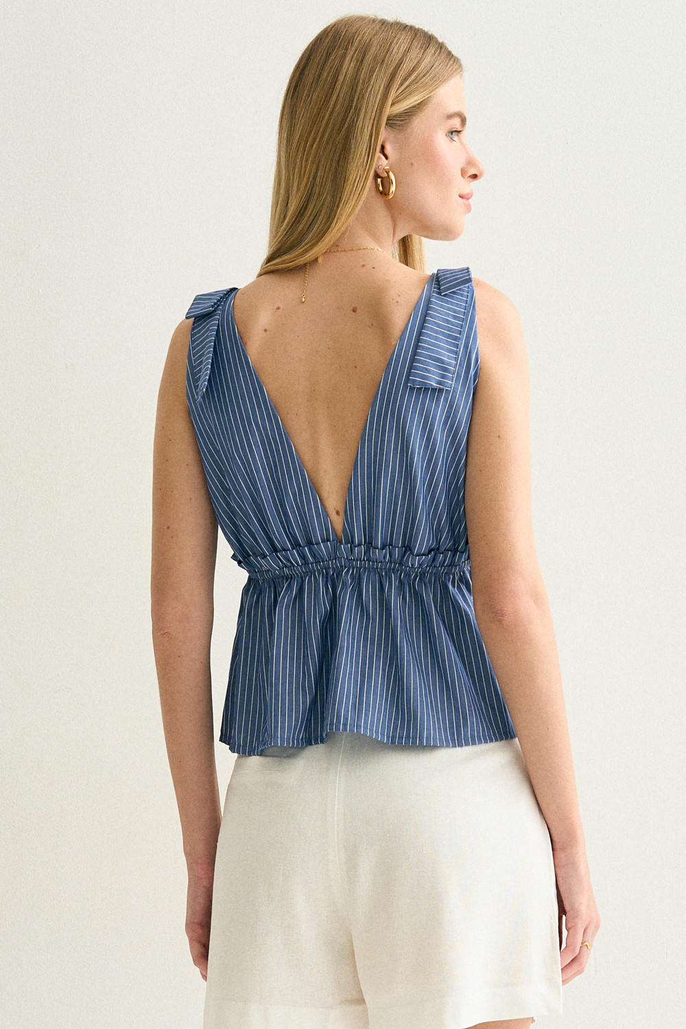 A Regata Listrada Amélia é confeccionada em algodão e traz conforto e respirabilidade para os dias mais quentes. O elástico embutido na cintura cria um caimento ajustado, valorizando a silhueta. Os laços fixos nos ombros (não desamarráveis) adicionam um detalhe romântico e feminino, tornando a regata ideal tanto para combinações descontraídas quanto para produções mais elegantes.